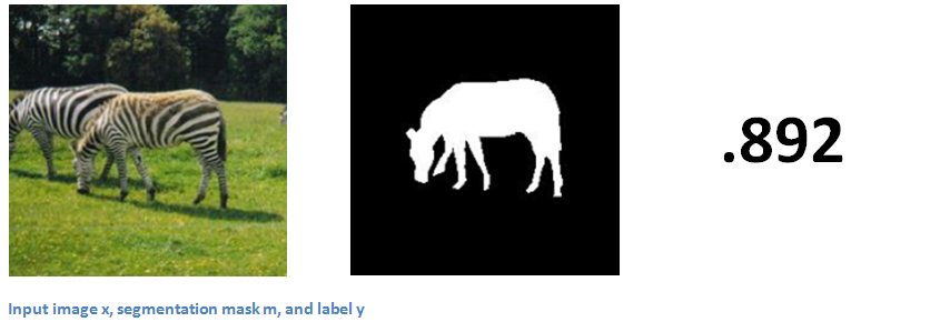 Let’s first visualize what want this model to do. Given an input image, we want the network to output a set of masks, or outlines, for each object. We can think of each input image as containing a set of patches (crops of the original image). For each input patch, the output is a binary mask that outlines the shape of the main object as well as a score (between -1 and 1) for how likely the input patch is to contain an object.