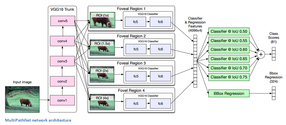 DeepMask generates coarse segmentation masks. SharpMask refines those outlines. MultiPathNet has the job of identifying or classifying the objects in the masks. A group consisting of Sergey Zagoruyko, Adam Lerer, Tsung-Yi Lin, Pedro Pinheiro, Sam Gross, Soumith Chintala, and Piotr Dollar published the paper titled “A MultiPath Network for Object Detection”. The goal of this paper is to improve on object detection techniques by focusing on higher precision localization as well as difficult images with scale variance, heavy occlusion, and clutter. This model takes Fast R-CNN as a starting point, so if you haven’t already, check out that paper or look at my previous blog post for a summary. Basically, this model is a way of implementing Fast R-CNN with DeepMask/SharpMask object proposals. The 3 main modifications that this paper introduced include skip connections, foveal regions, and an integral loss function. Let’s look at the network architecture before diving into each of those.