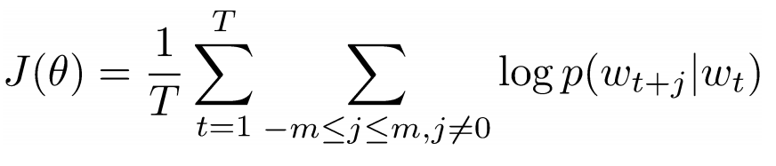 Now, our goal is to take the center word, ‘love’, and predict the words that come before and after it. How do we do this? By maximizing/optimizing a function of course! Formally, our function seeks to maximize the log probability of any context word given the current center word.