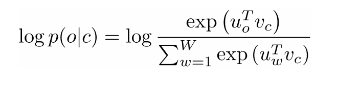 Vc is the word vector of the center word. Every word has two vector representations (Uo and Uw), one for when the word is used as the center word and one for when it’s used as the outer word. The vectors are trained with stochastic gradient descent. This is definitely one of the more confusing equations to understand, so if you’re still having trouble visualizing what’s happening, you can go here and here for additional resources.