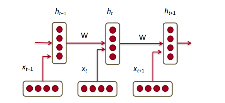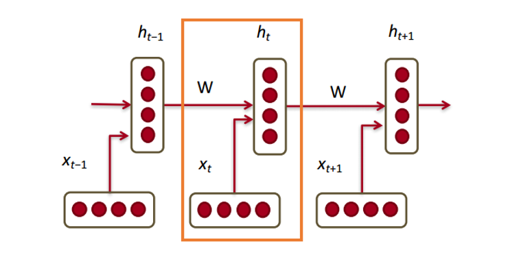 So, at the bottom we have our word vectors (xt, xt-1, xt+1). Each of the vectors has a hidden state vector at that same time step (ht, ht-1, ht+1). Let’s call this one module.