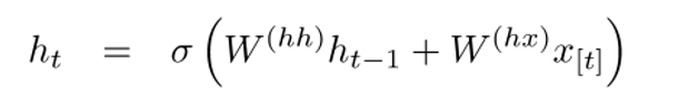 If you take a close look at the superscripts, you’ll see that there’s a weight matrix Whx which we’re going to multiply with our input, and there’s a recurrent weight matrix Whh which is multiplied with the hidden state vector at the previous time step. Keep in mind that these recurrent weight matrices are the same across all time steps. This is the key point of RNNs. Thinking about this carefully, it’s very different from a traditional 2 layer NN for example. In that case, we normally have a distinct W matrix for each layer (W1 and W2). Here, the recurrent weight matrix is the same through the network.