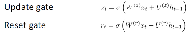 The GRU provides a different way of computing this hidden state vector h(t). The computation is broken up into 3 components, an update gate, a reset gate, and a new memory container. The two gates are both functions of the input word vector and the hidden state at the previous time step.