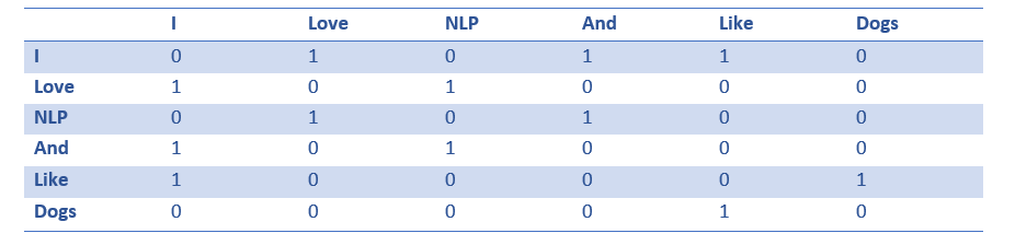 Notice that through this simple matrix, we’re able to gain pretty useful insights. For example, notice that the words ‘love’ and ‘like’ both contain 1’s for their counts with nouns (NLP and dogs). They also have 1’s for the count with “I”, thus indicating that the words must be some sort of verb. With a larger dataset than just one sentence, you can imagine that this similarity will become more clear as ‘like’, ‘love’, and other synonyms will begin to have similar word vectors, because of the fact that they are used in similar contexts.