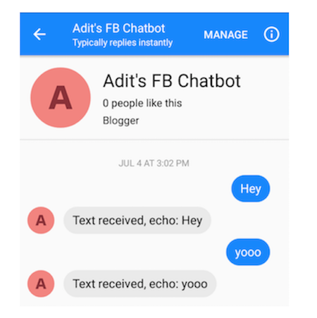 And you should be able to message your bot (This initial behavior is just echoing everything it gets sent).