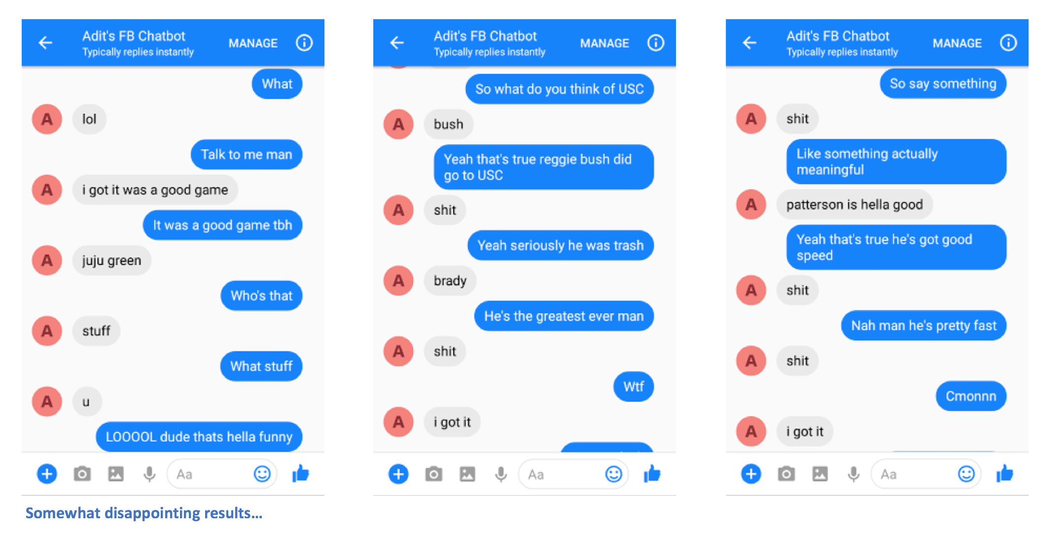 It’s probably difficult to judge whether or not the bot actually does talk like me (since not a lot of you have talked to me online LOL), but I’d say it’s doing alright! The grammar is passable, considering social media standards. You can cherry pick a couple good results, but most are pretty nonsensical. Here are some of the ones which help me sleep better at night because Skynet definitely isn’t happening any time soon.