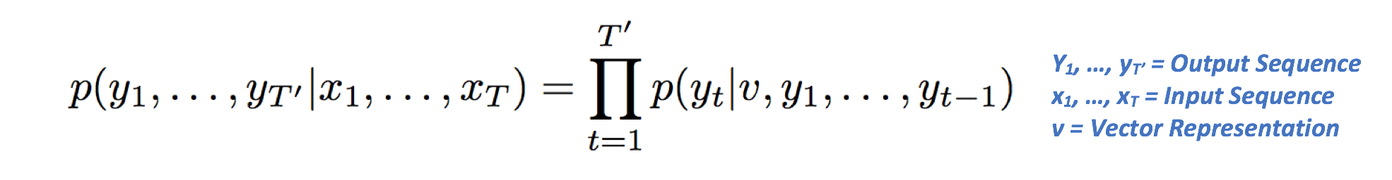 Let's deconstruct what that equation means. The left side refers to the probability of the output sequence, conditioned on the given input sequence. The right side contains the term p(yt|v, y1, …, yt-1), which is a vector of probabilities of all the words, conditioned on the vector representation and the outputs at the previous time steps. The Pi notation is simply the multiplication equivalent of Sigma (or summation). The right hand side can be reduced to p(y1|v) * p(y2|v, y1) * p(y3|v, y1, y2) ... and so on.