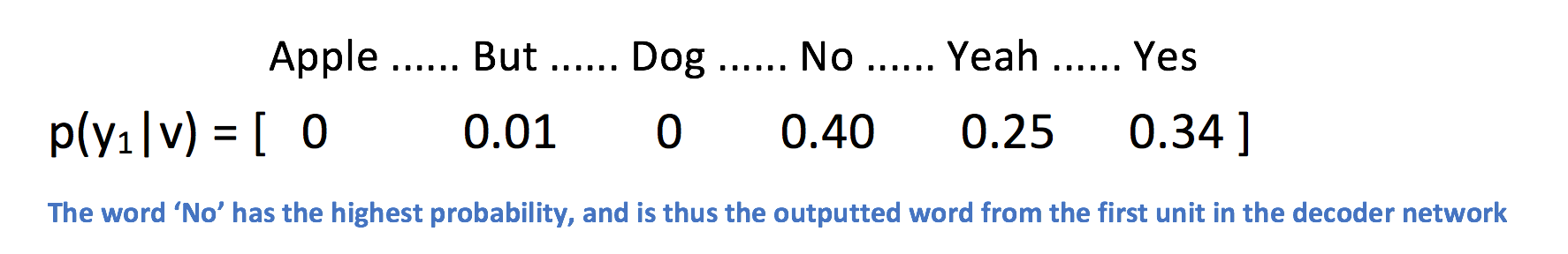 Let’s go over a quick example before moving on. Let’s take the input text we saw in the first image. Given the phrase “Are you free tomorrow?”, let’s think about how most people would answer the question. A majority will start with something along the lines of “Yes”, “Yeah”, “No”, etc. After we’re done training our network, the probability p(y1|v) will be a distribution that looks like the following.