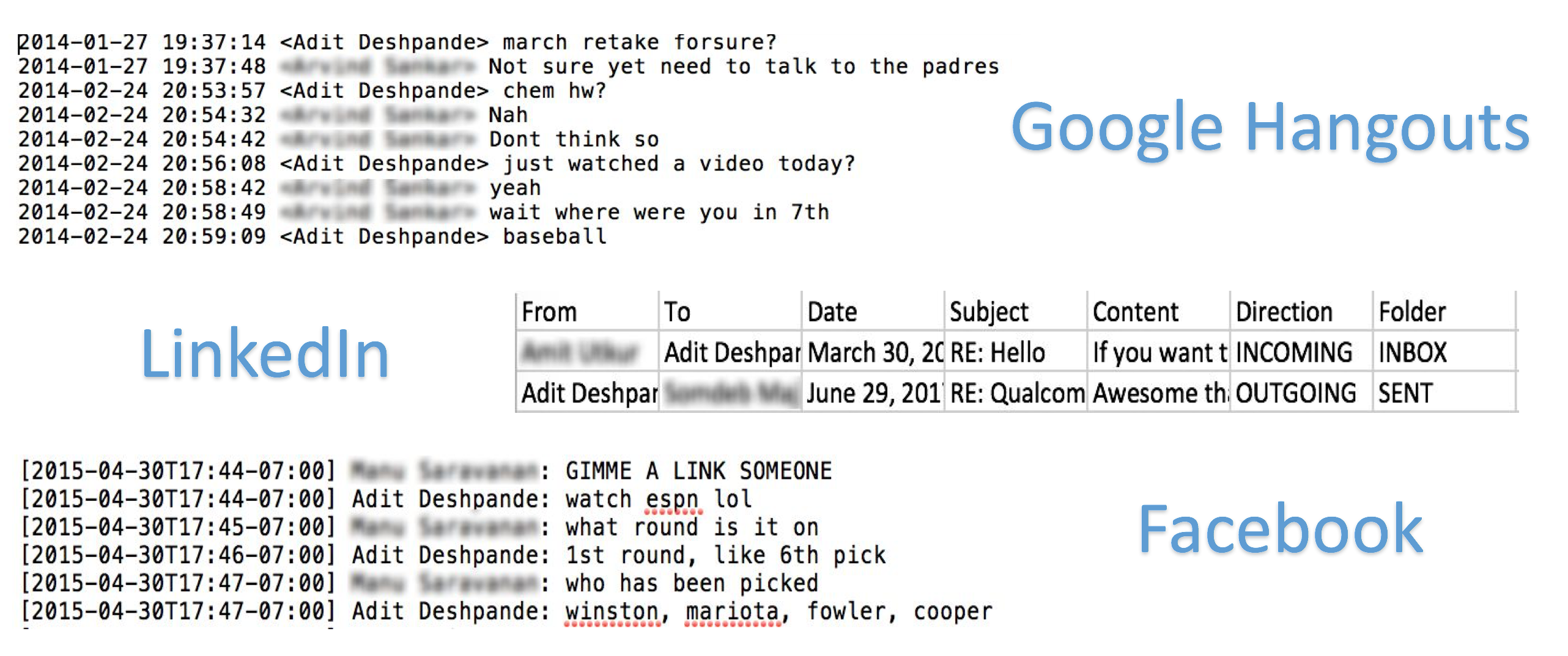 As you can see, the Hangouts data is formatted a bit differently from the Facebook data, and the LinkedIn messages are in a CSV format. Our goal, with all these datasets, is to just create one unified file that contains pairs in the form of (FRIENDS_MESSAGE, YOUR_RESPONSE).