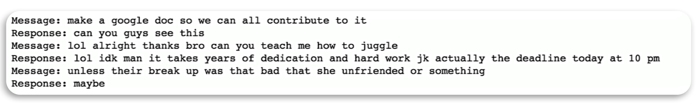 To do that, I wrote a Python script that you can check out here. This script will create two different files. One will be a Numpy object (conversationDictionary.npy) that contains all of the input output pairs. The other will be a large txt file (conversationData.txt) that contains these pairs in sentence form, one after the other. Normally, I love being able to share datasets, but for this specific one, I’m keeping it private just because it has a lot of private conversations, and I don’t think my friends would be happy if they were just floating around on the internet. But here’s a snapshot of how the final dataset looks like.