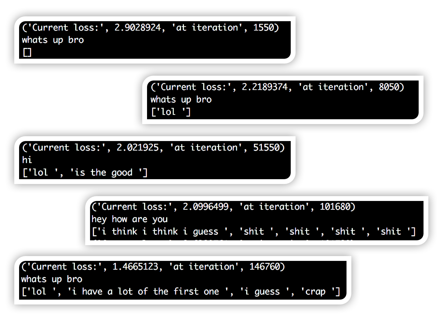 One of the interesting aspects of this project was getting a chance to look at how the responses changed as the network trained. At different points in the training loop, I tested the network on an input string, and outputted all of the non-pad and non-EOS tokens in the output. At first, you can see that the responses were mainly blank, as the network repeatedly outputted padding and EOS tokens. This is normal since padding tokens are by far the most frequent token in the whole dataset. Then, you can see that the network starts to output ‘lol’ for every single input string it is given. This makes sense intuitively since ‘lol’ gets used so often these days that it kind of is an acceptable response to anything. Slowly, you start to see more complete thoughts and grammatical structure come up in the responses. Could be due to a bit of overfitting as well.