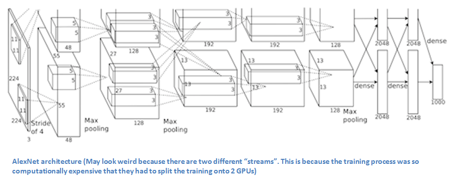 In the paper, the group discussed the architecture of the network (which was called AlexNet). They used a relatively simple layout, compared to modern architectures. The network was made up of 5 conv layers, max-pooling layers, dropout layers, and 3 fully connected layers. The network they designed was used for classification with 1000 possible categories.