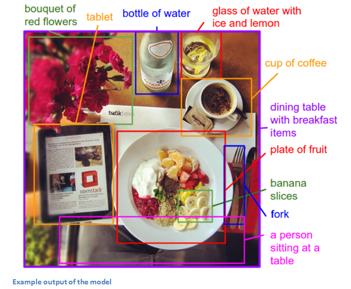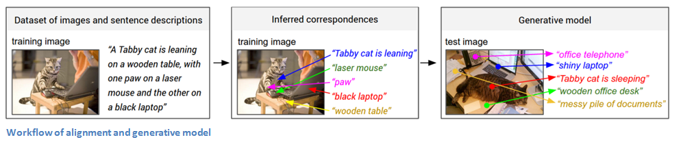 That’s pretty incredible. Let’s look at how this compares to normal CNNs. With traditional CNNs, there is a single clear label associated with each image in the training data. The model described in the paper has training examples that have a sentence (or caption) associated with each image. This type of label is called a weak label, where segments of the sentence refer to (unknown) parts of the image. Using this training data, a deep neural network “infers the latent alignment between segments of the sentences and the region that they describe” (quote from the paper). Another neural net takes in the image as input and generates a description in text. Let’s take a separate look at the two components, alignment and generation.