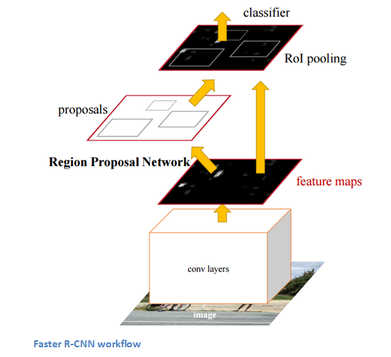 Faster R-CNN works to combat the somewhat complex training pipeline that both R-CNN and Fast R-CNN exhibited. The authors insert a region proposal network (RPN) after the last convolutional layer. This network is able to just look at the last convolutional feature map and produce region proposals from that. From that stage, the same pipeline as R-CNN is used (ROI pooling, FC, and then classification and regression heads).