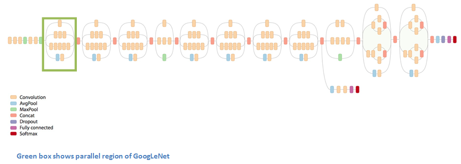 When we first take a look at the structure of GoogLeNet, we notice immediately that not everything is happening sequentially, as seen in previous architectures. We have pieces of the network that are happening in parallel.