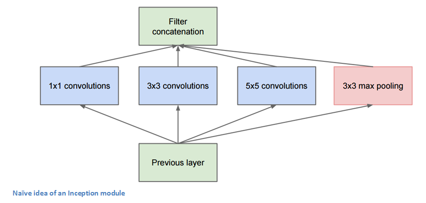 The bottom green box is our input and the top one is the output of the model (Turning this picture right 90 degrees would let you visualize the model in relation to the last picture which shows the full network). Basically, at each layer of a traditional ConvNet, you have to make a choice of whether to have a pooling operation or a conv operation (there is also the choice of filter size). What an Inception module allows you to do is perform all of these operations in parallel. In fact, this was exactly the “naïve” idea that the authors came up with.