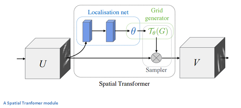 • A localization network which takes in the input volume and outputs parameters of the spatial transformation that should be applied. The parameters, or theta, can be 6 dimensional for an affine transformation.