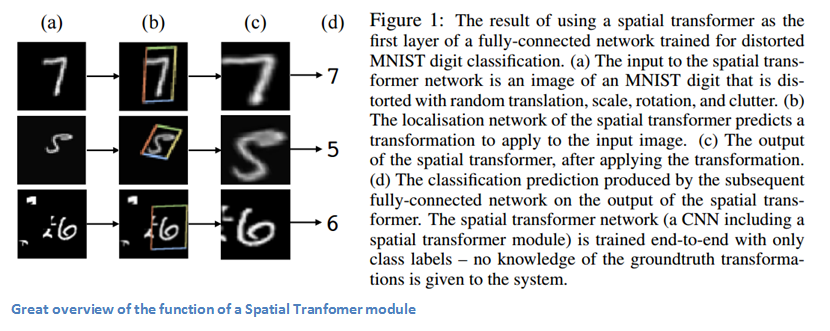 Last, but not least, let’s get into one of the more recent papers in the field. This paper was written by a group at Google Deepmind a little over a year ago. The main contribution is the introduction of a Spatial Transformer module. The basic idea is that this module transforms the input image in a way so that the subsequent layers have an easier time making a classification. Instead of making changes to the main CNN architecture itself, the authors worry about making changes to the image before it is fed into the specific conv layer. The 2 things that this module hopes to correct are pose normalization (scenarios where the object is tilted or scaled) and spatial attention (bringing attention to the correct object in a crowded image). For traditional CNNs, if you wanted to make your model invariant to images with different scales and rotations, you’d need a lot of training examples for the model to learn properly. Let’s get into the specifics of how this transformer module helps combat that problem.