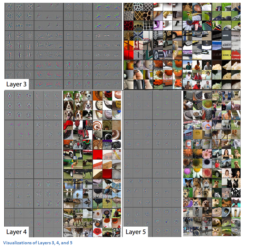 These layers show a lot more of the higher level features such as dogs’ faces or flowers. One thing to note is that as you may remember, after the first conv layer, we normally have a pooling layer that downsamples the image (for example, turns a 32x32x3 volume into a 16x16x3 volume). The effect this has is that the 2nd layer has a broader scope of what it can see in the original image. For more info on deconvnet or the paper in general, check out Zeiler himself presenting on the topic.