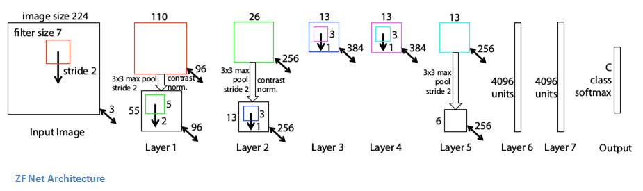 • Instead of using 11x11 sized filters in the first layer (which is what AlexNet implemented), ZF Net used filters of size 7x7 and a decreased stride value. The reasoning behind this modification is that a smaller filter size in the first conv layer helps retain a lot of original pixel information in the input volume. A filtering of size 11x11 proved to be skipping a lot of relevant information, especially as this is the first conv layer.